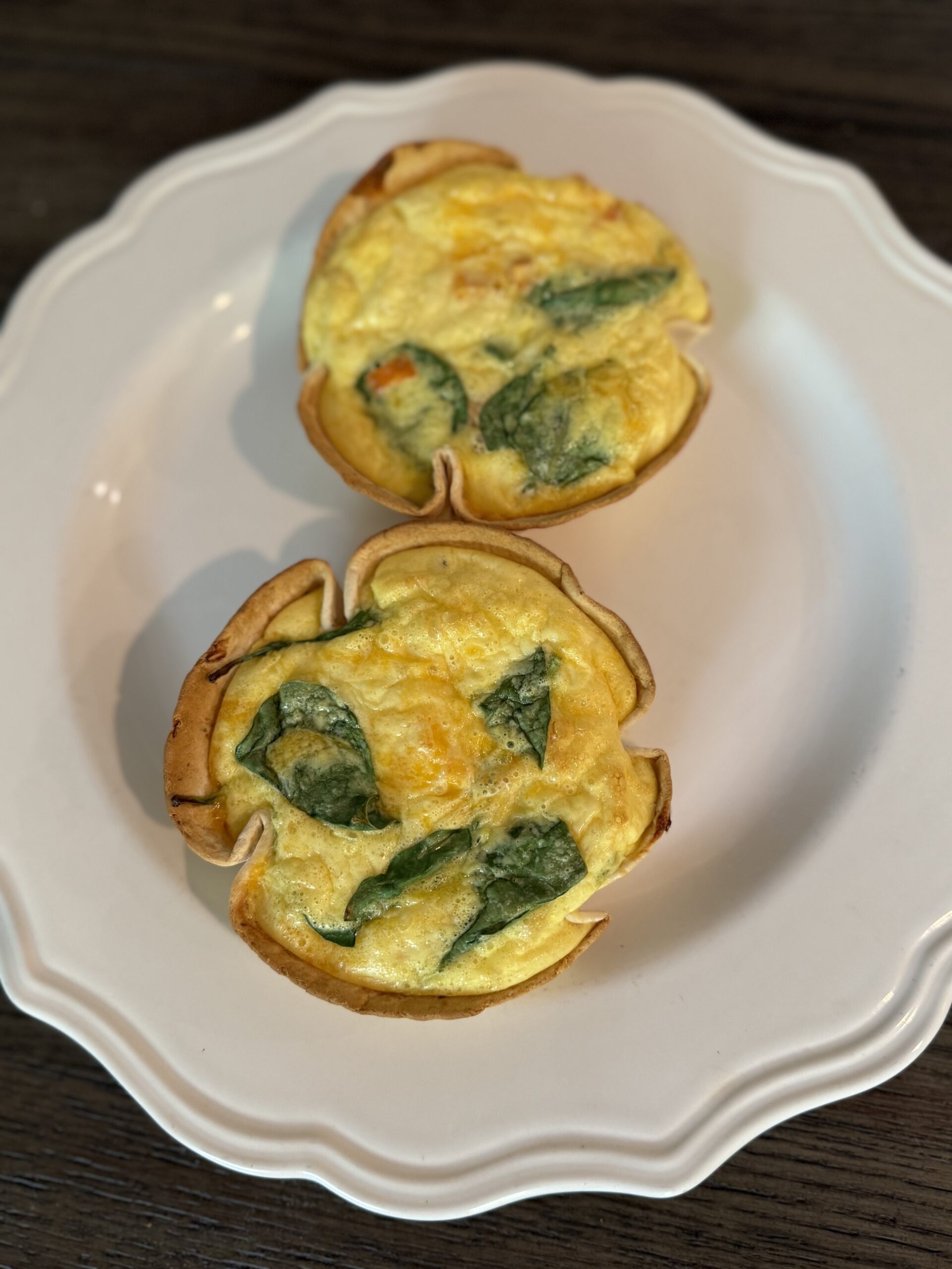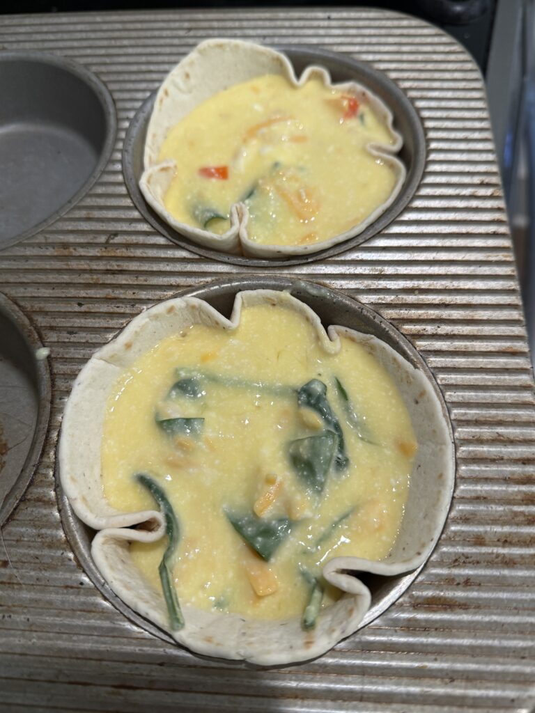 Spinach, egg, skim milk, and a little cheese, seasoned with salt and pepper. Baked at 350 until the eggs were cooked and tortilla crispy. Easy and very tasty. Not low fat but very balanced.