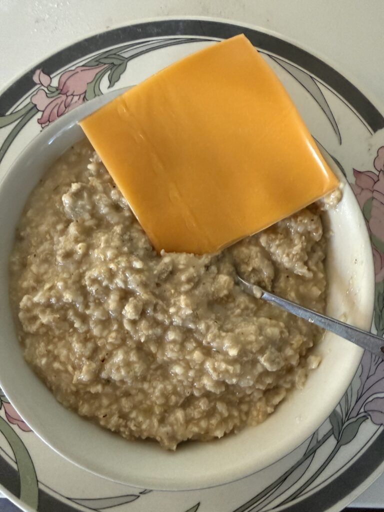 Oatmeal doesn’t have to be a sweet meal. I’ve always hated oatmeal because I only ate it as a sweet dish with cinnamon. When I started making it a savory dish, my attitude toward oatmeal changed. This breakfast is oatmeal cooked in turkey broth, with lean ground turkey, and a slice of fat free cheese, and a spice to liven it up.